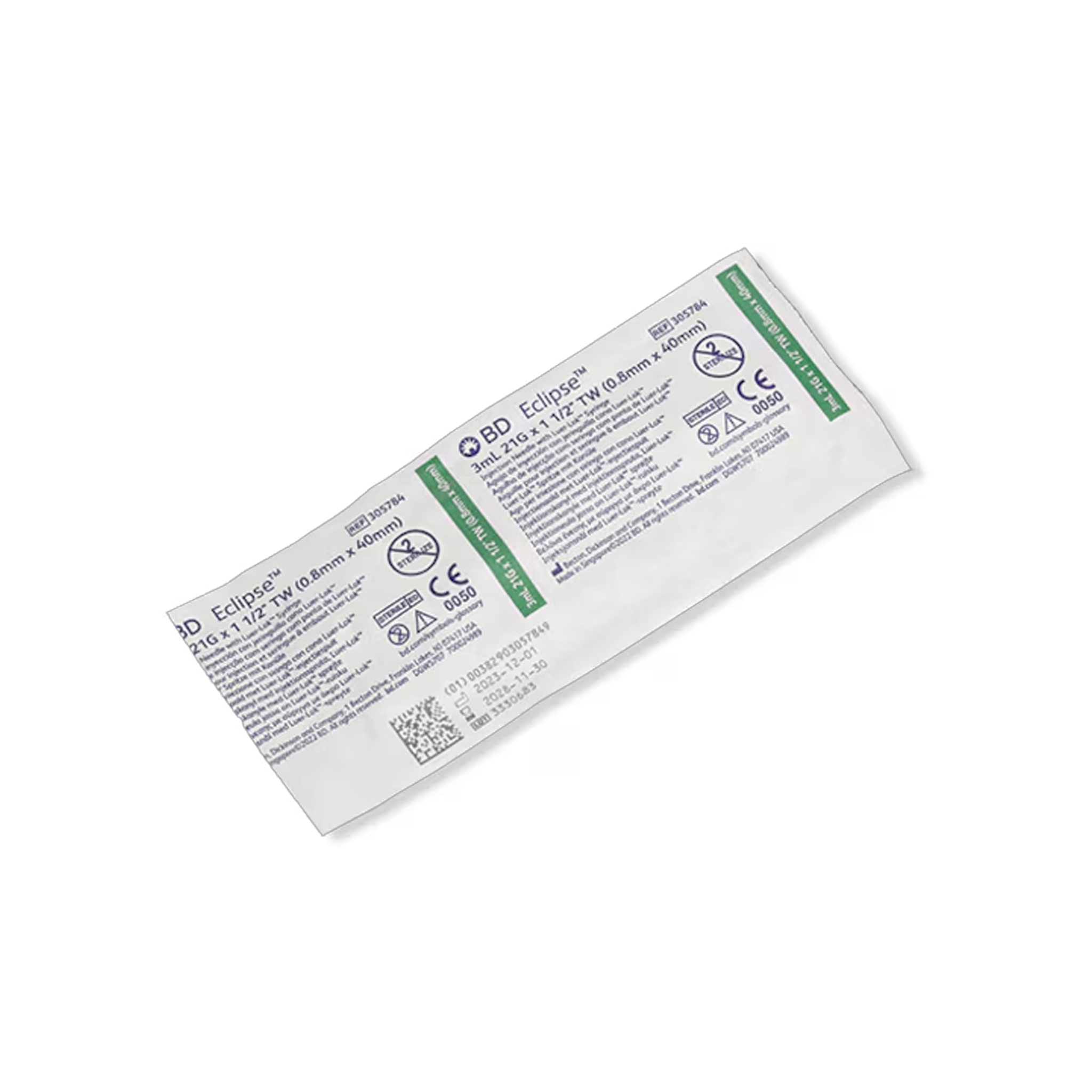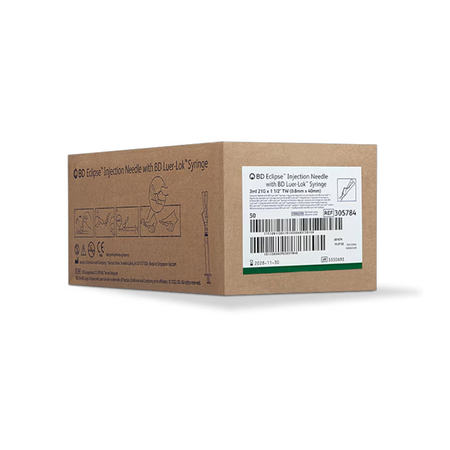 BD Eclipse™ Needle and Syringe – 3 mL BD Luer-Lok™ Syringe with Detachable 21 G × 1 ½ in. Eclipse™ Needle provides a secure and safe solution for deep intramuscular injections. The Eclipse™ needle shield reduces needlestick injury risk, while the Luer-Lok™ syringe delivers a tight, reliable seal for consistent performance.