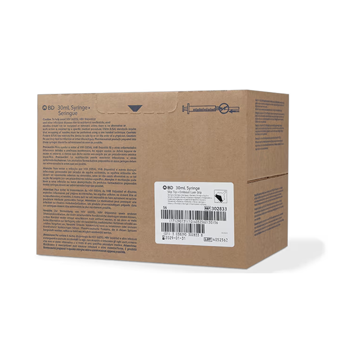 BD® 30 mL Slip Tip Syringe Only combines accuracy and ease of use for large-volume clinical or laboratory procedures. The slip tip design allows quick, friction-fit attachment and removal of compatible needles and devices for flexible operation.