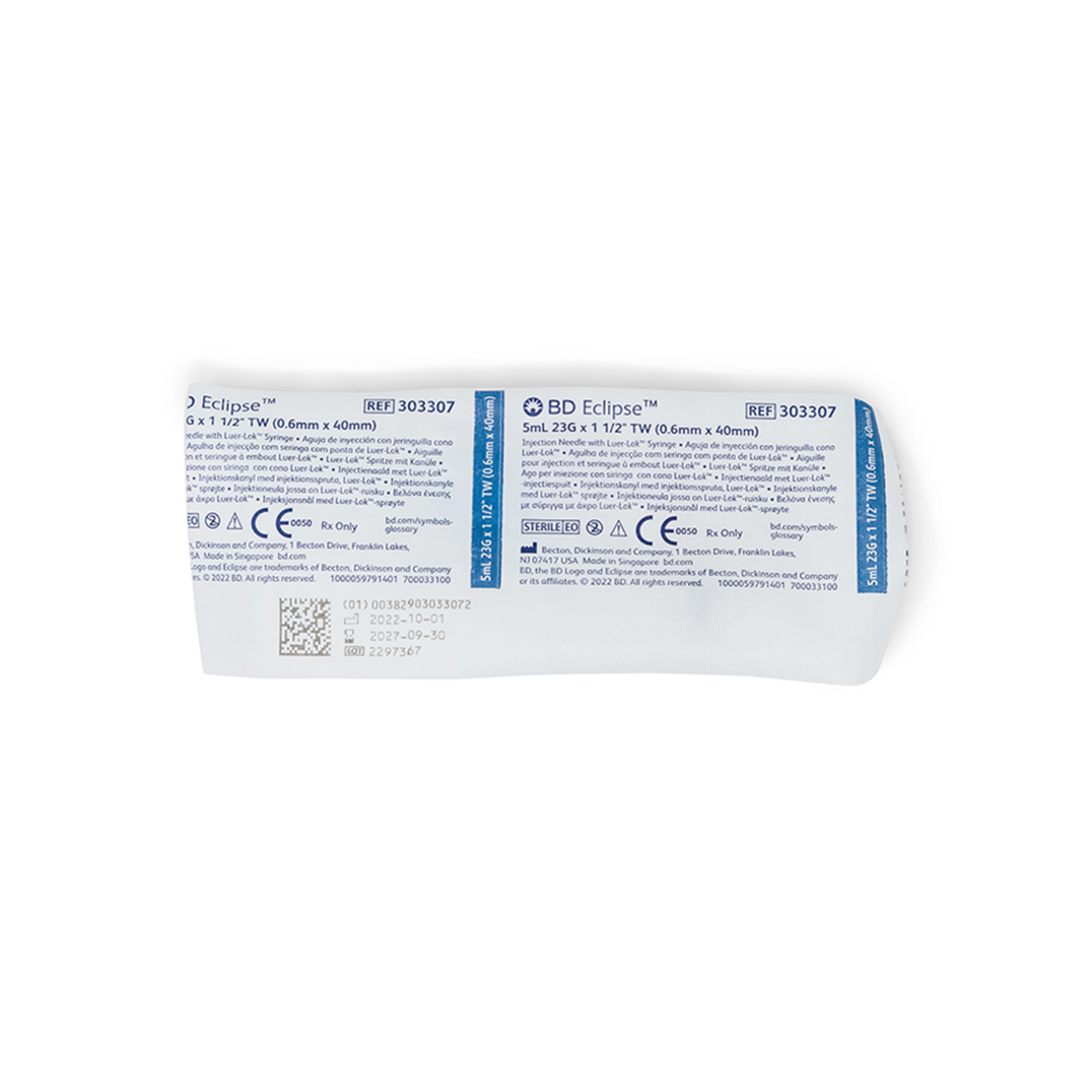 BD Eclipse™ Needle and Syringe – 5 mL BD Luer-Lok™ Syringe with Detachable 23 G × 1 ½ in. Eclipse™ Needle provides enhanced safety and precision for intramuscular and large-volume injections. Featuring the Eclipse™ single-handed safety shield and secure Luer-Lok™ connection, it offers reliable performance and protection in clinical environments.