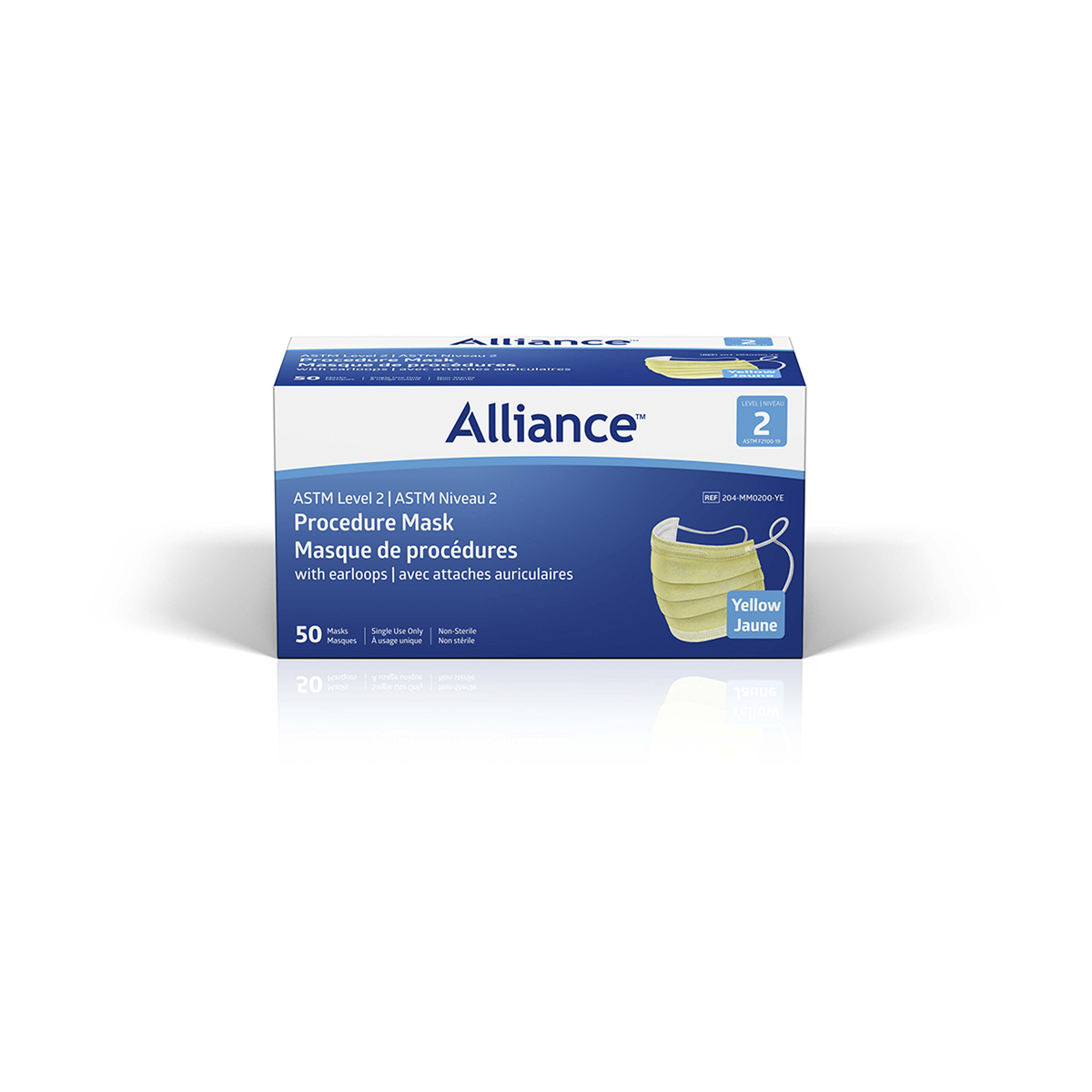 The Alliance ASTM Level 2 Surgical Face Mask with Ear Loops (REF #204-MM0200-YE) offers dependable protection and a comfortable fit for healthcare procedures. Its flat pleated construction provides a secure seal while maintaining breathability and comfort throughout extended wear.