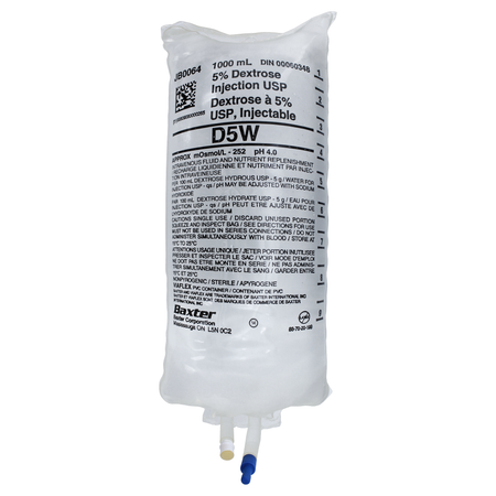 Baxter's 5% Dextrose Injection, USP in a 1000 mL VIAFLEX PVC container is a sterile, nonpyrogenic, isotonic carbohydrate solution formulated for intravenous administration. It provides a dependable source of dextrose for fluid replacement and caloric support in clinical care settings. Packaged in flexible, durable VIAFLEX bags and supplied in cases of 12, this solution is designed for consistent performance in hospitals, clinics, and acute care environments.