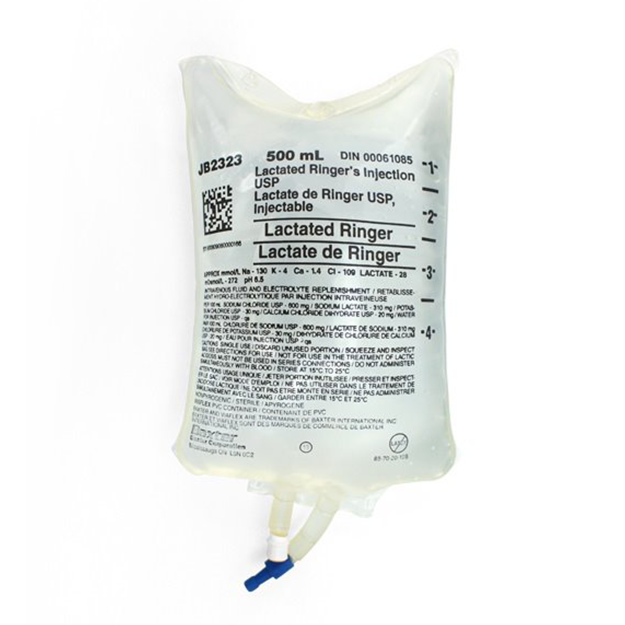 Baxter's Lactated Ringer’s Injection, USP in a 500 mL VIAFLEX PVC container is a sterile, nonpyrogenic, balanced electrolyte solution designed for intravenous administration. Formulated to closely match the body’s extracellular fluid composition, it provides essential electrolytes—sodium, potassium, calcium, chloride, and lactate—to support fluid replacement, maintain acid–base balance, and aid in physiological stabilization. Packaged in flexible VIAFLEX bags and supplied in cases of 24, this solution is a dependable choice for routine hydration and resuscitation needs in medical settings.