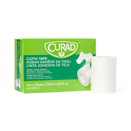 Specifications: CURAD® Premium Cloth “Silk” Tape, 3" x 10 yd.; strong, water-repellent, latex-free; 4 rolls per box, 10 boxes per case (40 per case).