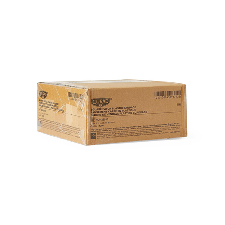 CURAD® Plastic Adhesive Bandages (Patch, 1½" x 1½" / 3.8 x 3.8 cm) offer square-shaped, waterproof protection ideal for small to medium-sized wounds. The durable plastic surface provides a strong seal against moisture and contaminants while maintaining breathability through micro-perforations.