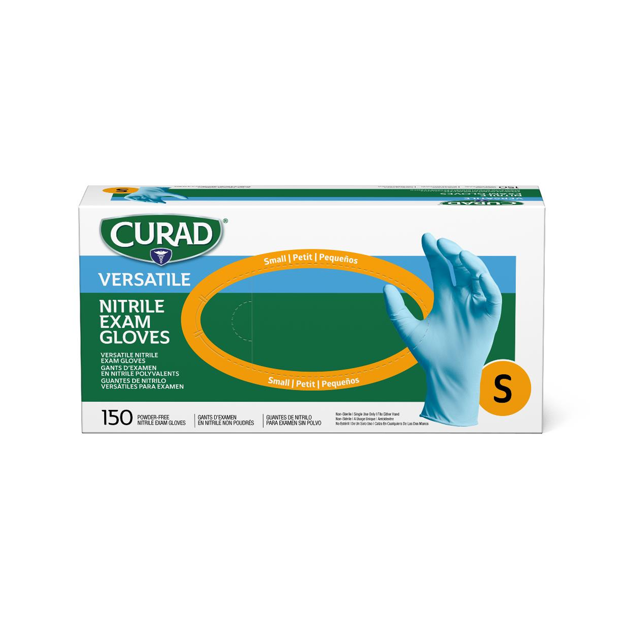 Specifications: CURAD® Nitrile Exam Gloves, Small, 4.9 mil, latex-free, light blue; 150 per box, 10 boxes per case (1,500 per case).