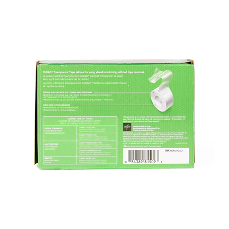 Specifications: CURAD® Premium Transparent Tape, ½" x 10 yd.; breathable, water-repellent, latex-free; 24 rolls per box, 10 boxes per case (240 per case).