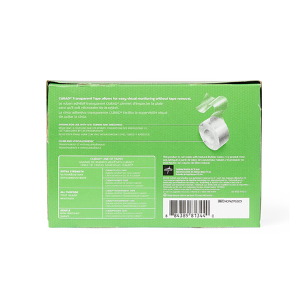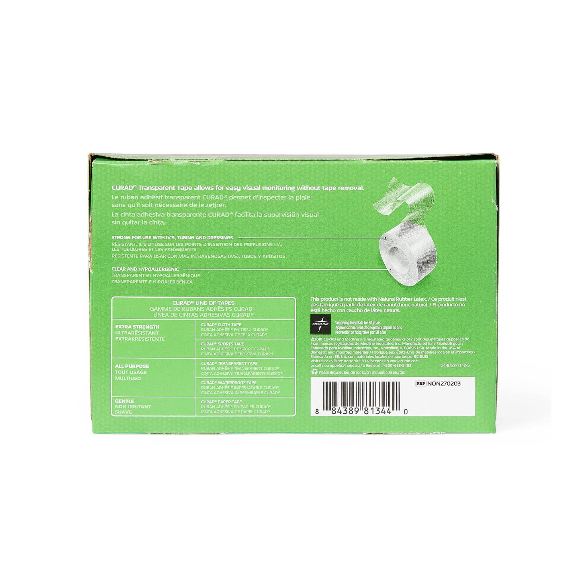 Specifications: CURAD® Premium Transparent Tape, 3" x 10 yd.; breathable, water-repellent, latex-free; 4 rolls per box, 10 boxes per case (40 per case).