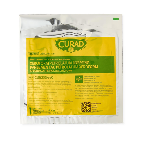 CURAD® Xeroform Sterile Nonadherent Gauze Dressings are fine-mesh, U.S.P. absorbent petrolatum gauze dressings impregnated with a 3% Bismuth Tribromophenate deodorizing agent. Designed to protect the wound bed, maintain a moist healing environment, and minimize trauma during dressing changes, these dressings cling and conform comfortably to body contours while allowing minimal drainage to pass through to a secondary dressing.