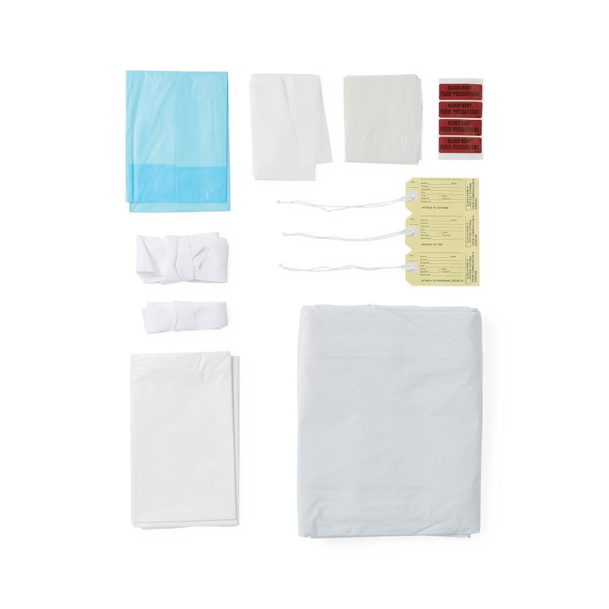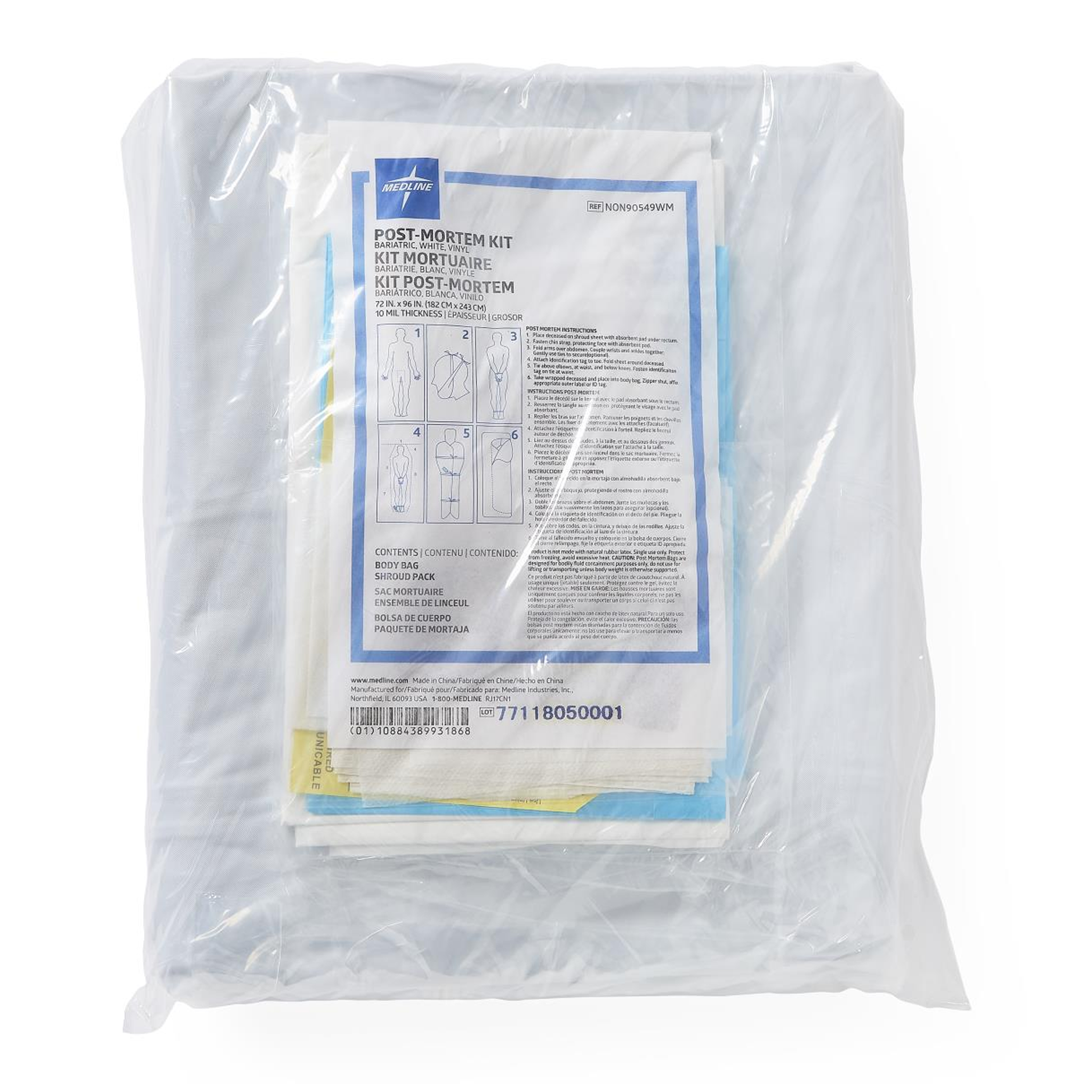 Medline® Adult Post-Mortem Kits are comprehensive containment systems designed to ensure respectful and hygienic handling of deceased individuals. Each kit provides essential components for containment, identification, and fluid management while meeting OSHA's Universal Precautions for protection against bloodborne pathogens and bodily fluids. The durable PVC body bag features a secure metal zipper closure for reliable containment during preparation and storage.