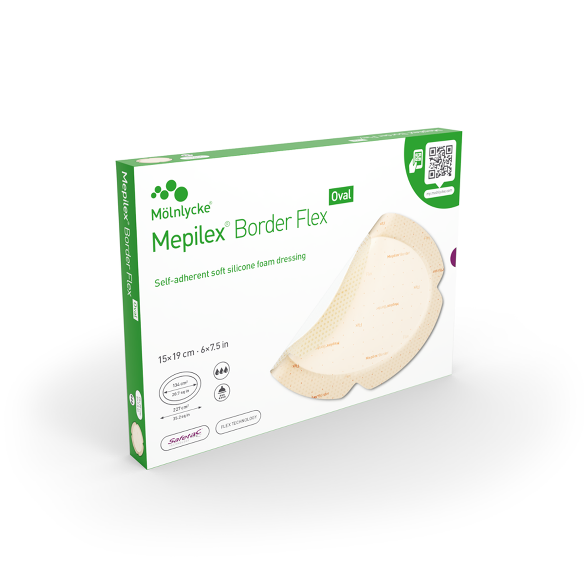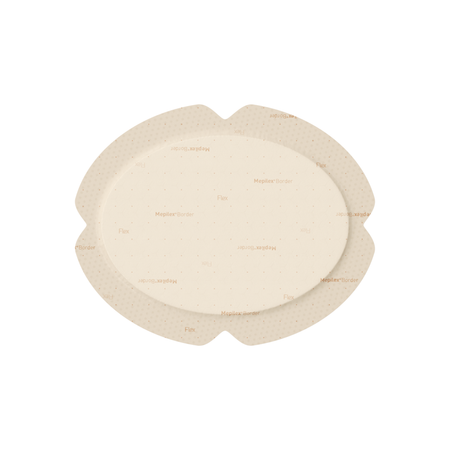 Mepilex® Border Flex Oval by Mölnlycke is a flexible, all-in-one foam dressing with Safetac® soft silicone technology, designed for low to moderately exuding wounds on contoured or mobile areas. Its oval shape provides a secure fit and superior conformability, making it ideal for sites such as elbows, knees, and heels. The innovative Flex Technology allows the dressing to move naturally with the body while maintaining adhesion and minimizing skin trauma.