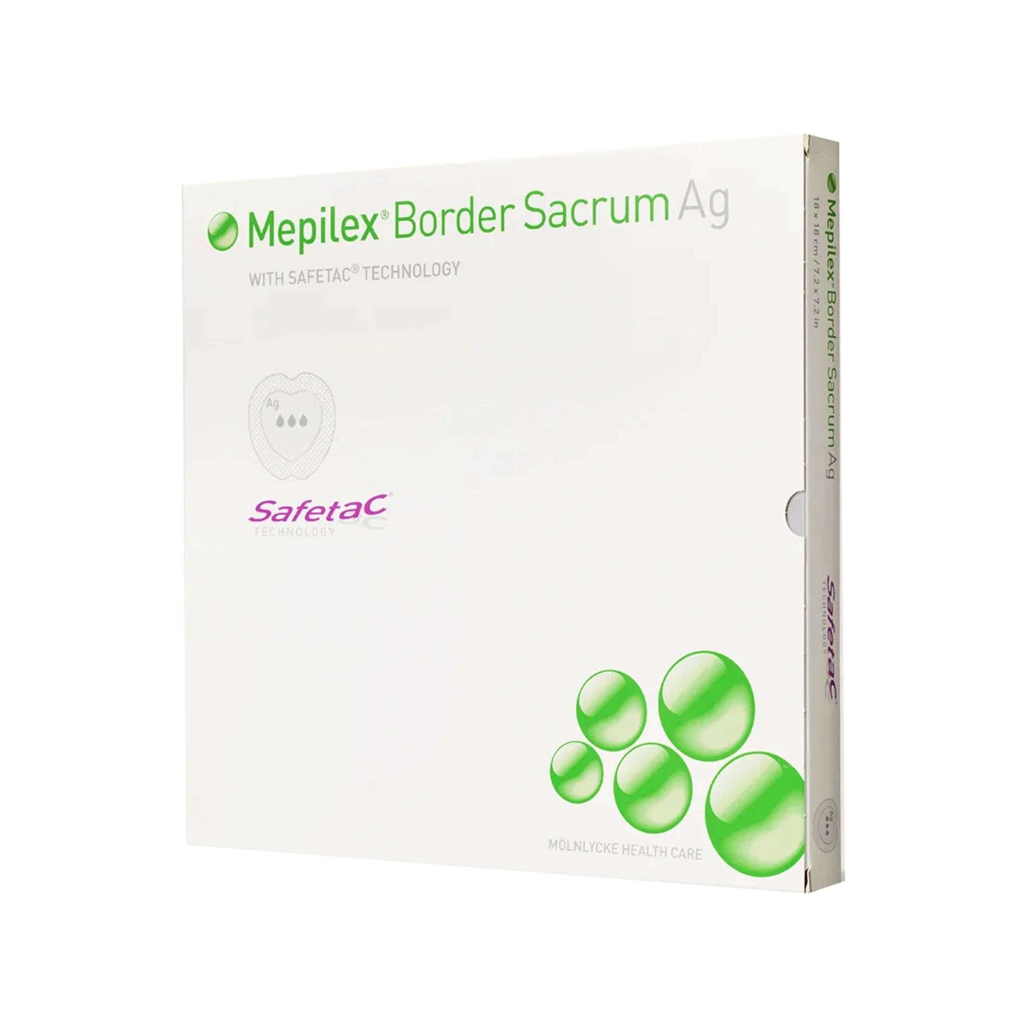 Mepilex® Border Sacrum Ag by Mölnlycke is an advanced antimicrobial foam dressing specifically shaped to fit the sacral area, designed for the management of medium to heavily exuding wounds at risk of infection. It combines Safetac® soft silicone technology with silver sulfate, providing sustained antimicrobial protection while minimizing pain and trauma during dressing changes. The multi-layer construction absorbs and retains exudate effectively, helping to maintain a moist environment conducive to healing.