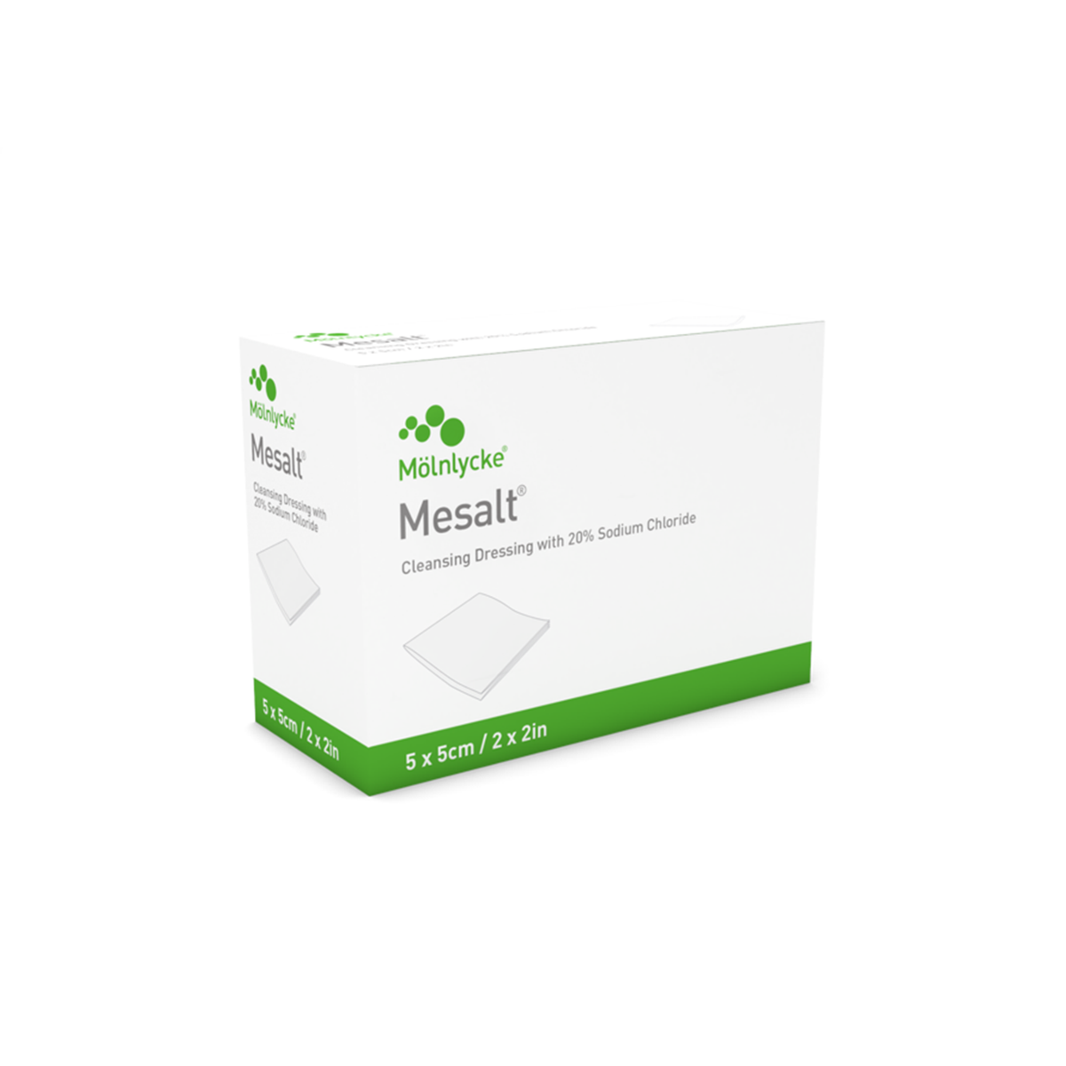 Mesalt® by Mölnlycke is a sodium chloride-impregnated dressing designed to stimulate the natural cleansing of heavily discharging or infected wounds. As the dressing absorbs exudate, sodium chloride is released, helping to draw out debris, necrotic tissue, and bacteria while supporting the body’s natural healing process. Mesalt® effectively manages wounds in the inflammatory phase by promoting gentle autolytic debridement.