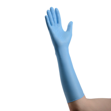 Cardinal Health™ Nitrile Decontamination Gloves are built for demanding environments, featuring an extended 16-inch cuff that offers extra coverage along the forearm. With a thicker nitrile design, these gloves are engineered for strength and durability, helping reduce the risk of exposure when working around sharps or hazardous materials.