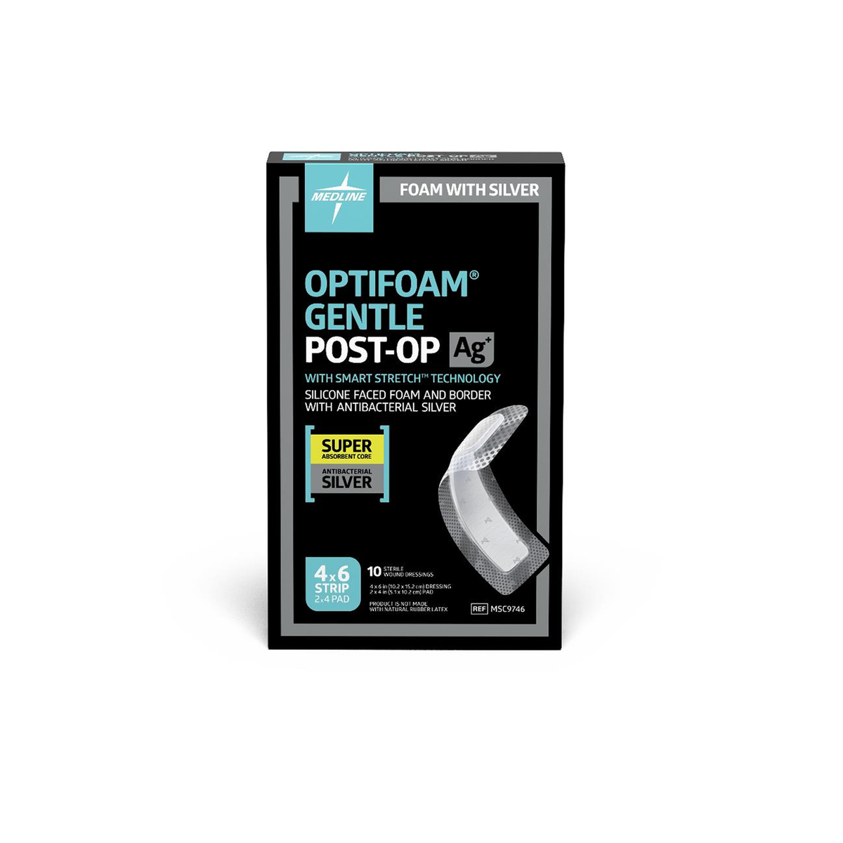 Optifoam® Gentle Ag+ Silicone-Faced Foam Post-Op Wound Dressings by Medline are advanced antimicrobial dressings designed to protect surgical incisions and post-operative wounds while promoting optimal healing conditions. These dressings combine soft, absorbent foam with a gentle silicone adhesive border and ionic silver for sustained antimicrobial protection. The waterproof film backing serves as a barrier against bacteria and external contaminants while maintaining a moist wound environment to support healing.