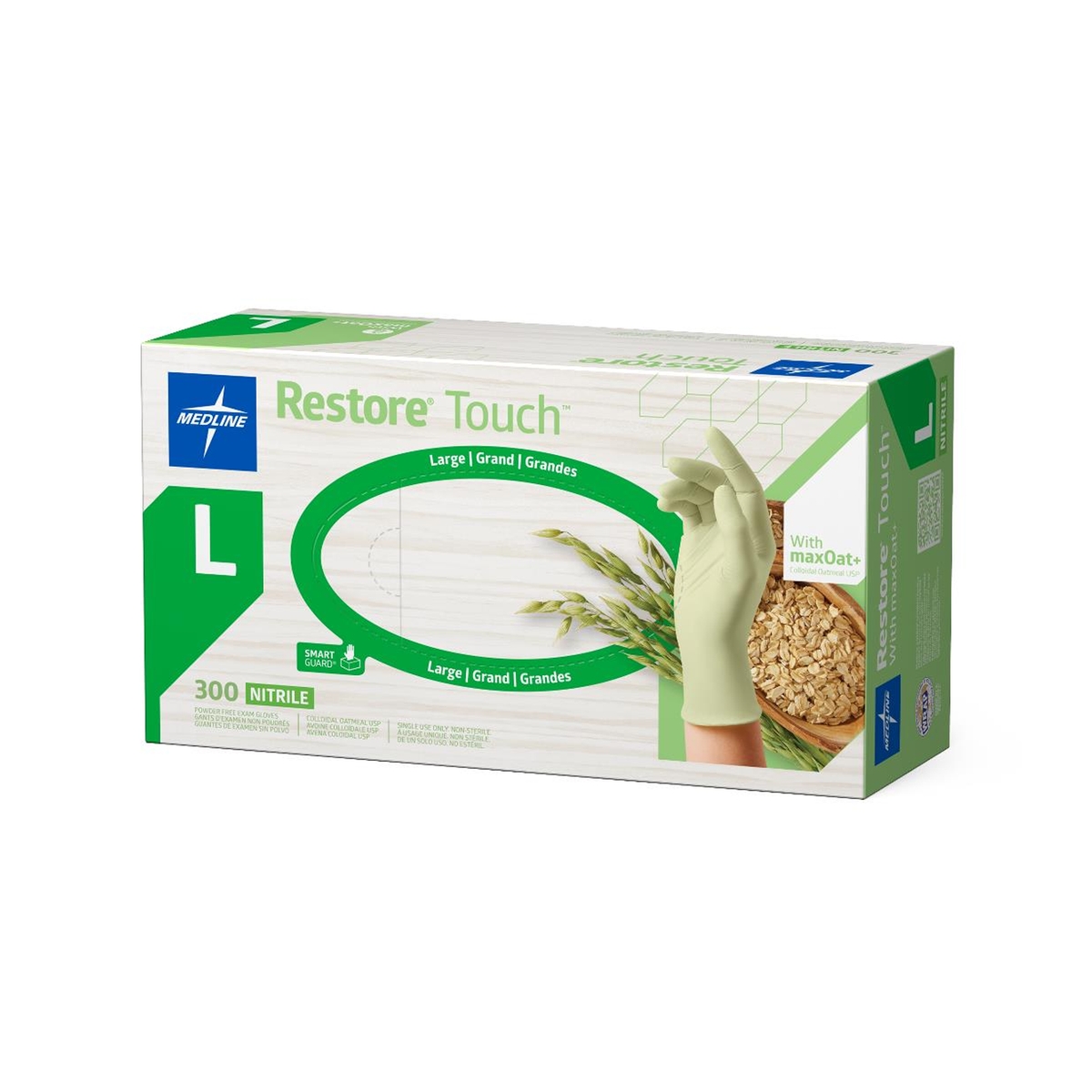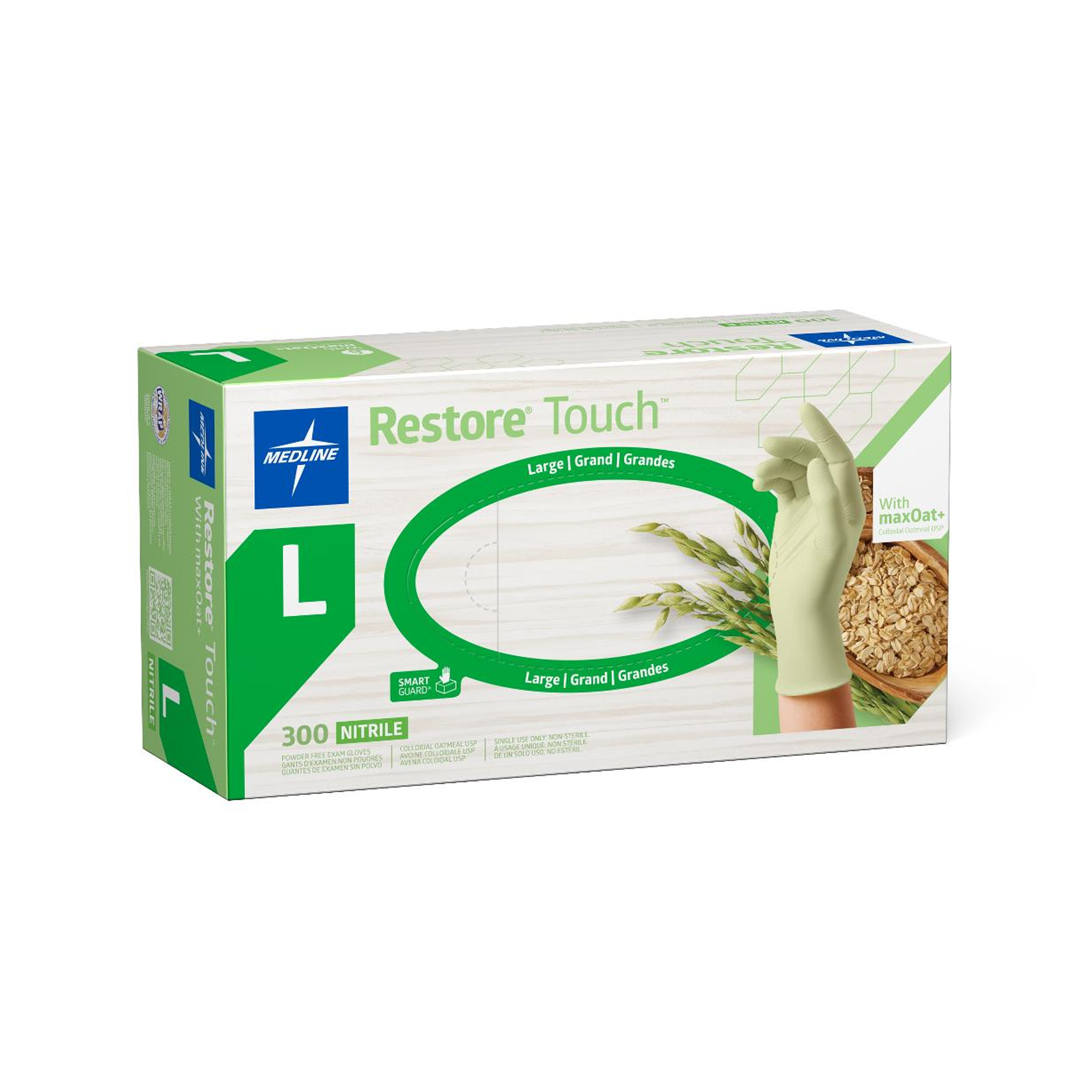 Specifications: Restore® Touch Nitrile Exam Gloves with Oatmeal, Large; chemo-rated; Gluten-Free certified; 3,000 per case.