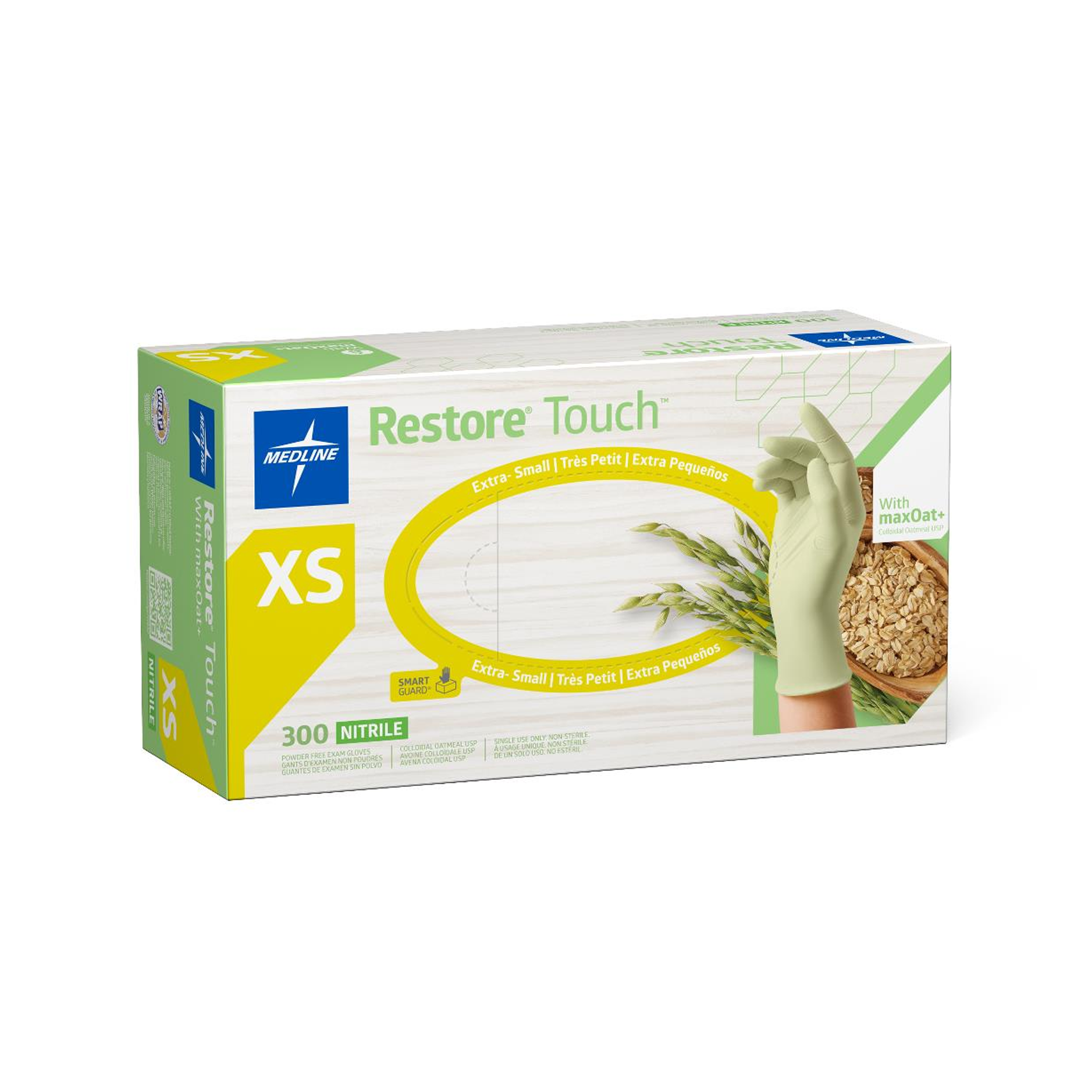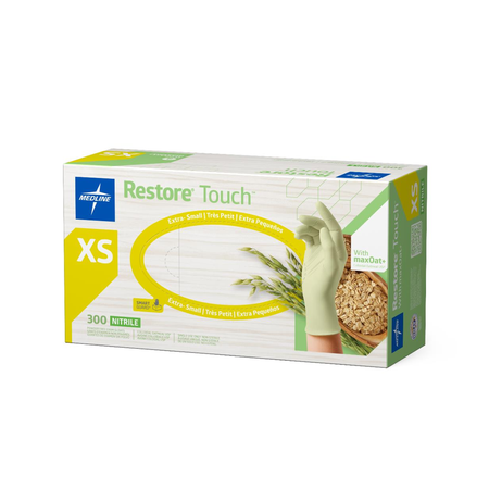 Specifications: Restore® Touch Nitrile Exam Gloves with Oatmeal, X-Small; chemo-rated; Gluten-Free certified; 3,000 per case.