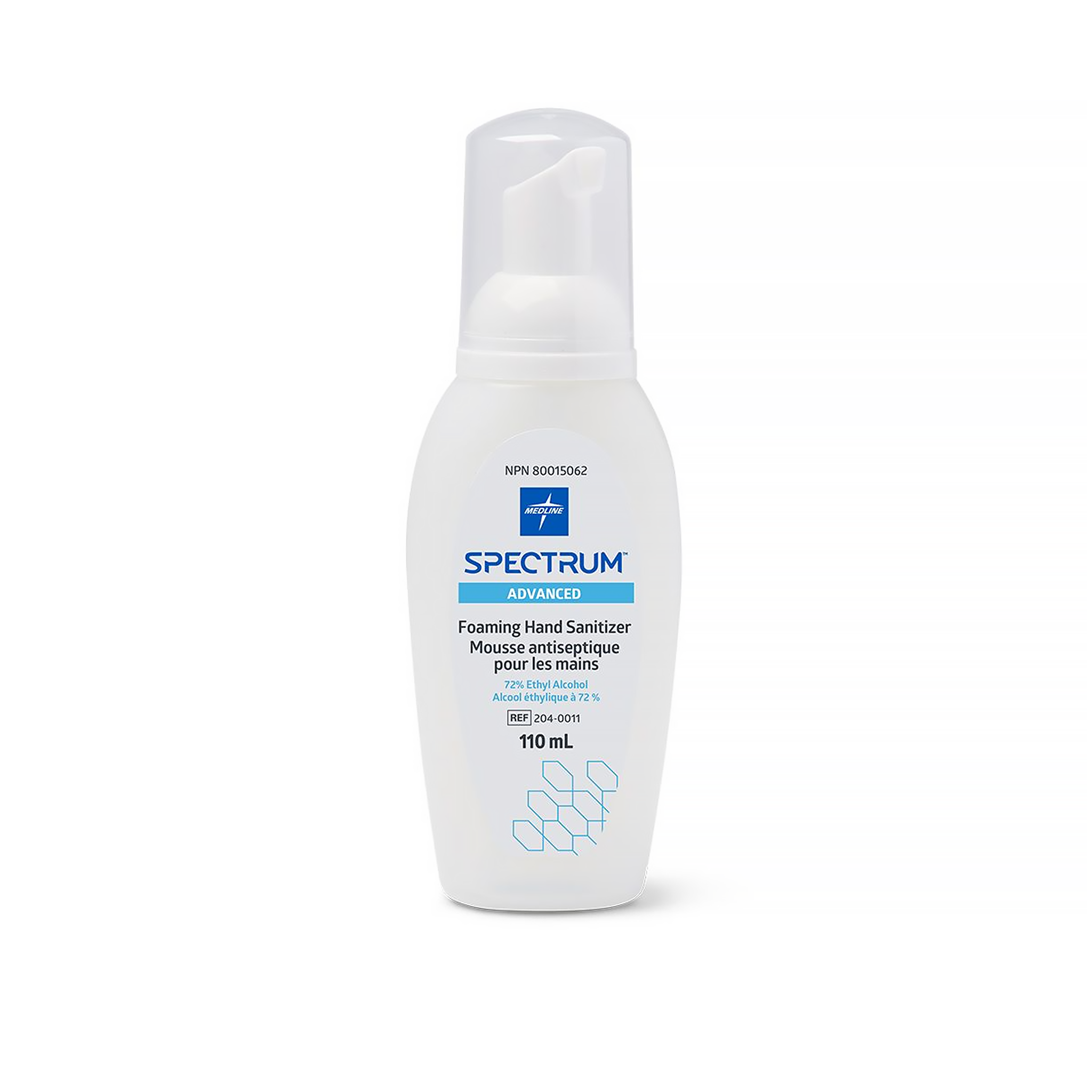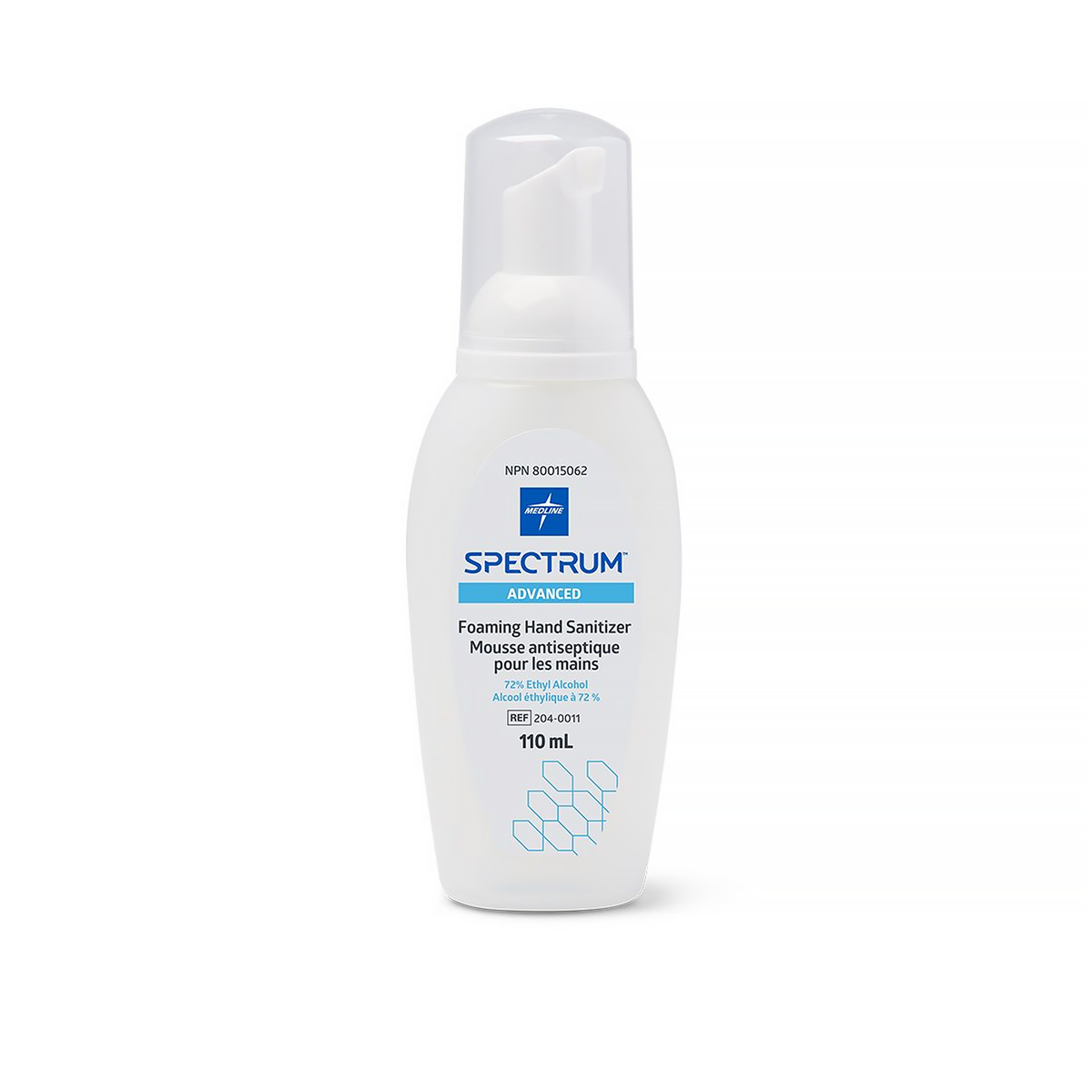 Specifications: Spectrum® Advanced Foam Hand Sanitizer, 72% alcohol, 110 mL pump bottle; 48 bottles per case, available individually or by case.
